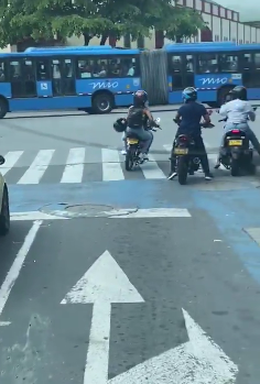 Buscan a esta pareja de motoladrones, que al no poder cometer un robo a un conductor, le dispara en varias oportunidades, hiriendo a una persona que viajaba como pasajero en un bus del MIO.