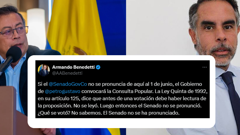 La declaración se dio a conocer en la antesala del paro nacional convocado para esta semana. Según Benedetti, el hundimiento del mecanismo no es válido porque no se leyó la proposición oficial del Gobierno antes de la votación, como exige la Ley Quinta del Congreso. Por ello, indicó que, de no haber una decisión formal antes del 1 de junio, Petro estaría habilitado para emitir un decreto.
