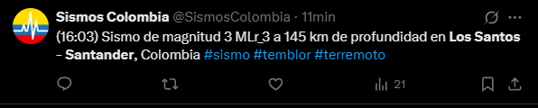 #SismosColombiaSGC Evento Sísmico - Boletín Actualizado 1, 2025-10-06, 16:03 hora local Magnitud 3.0, Profundidad 145 km, Los Santos - Santander, Colombia ¿Sintió este sismo? repórtelo https://t.co/pgC7OC2O7j https://t.co/63pt8nVsSe #NoticiaEnDesarrollo #Temblor pic.twitter.com/E2PAY3UIBH