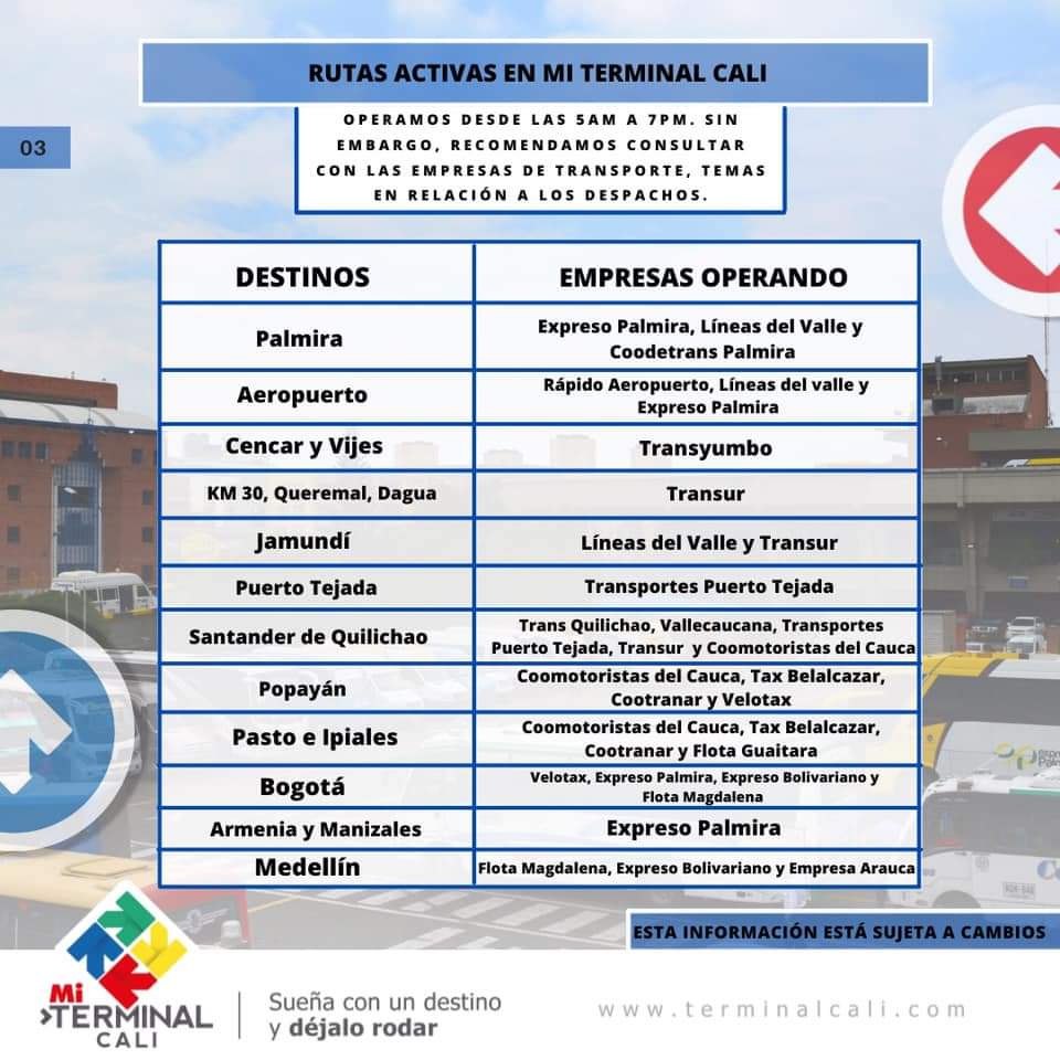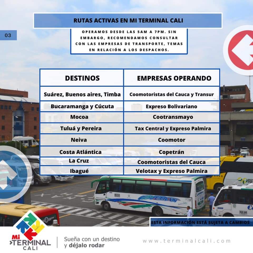 31 rutas a través de 20 empresas ya están operando desde la Terminal de Transporte de Cali, gracias a los desbloqueos por la asistencia militar.