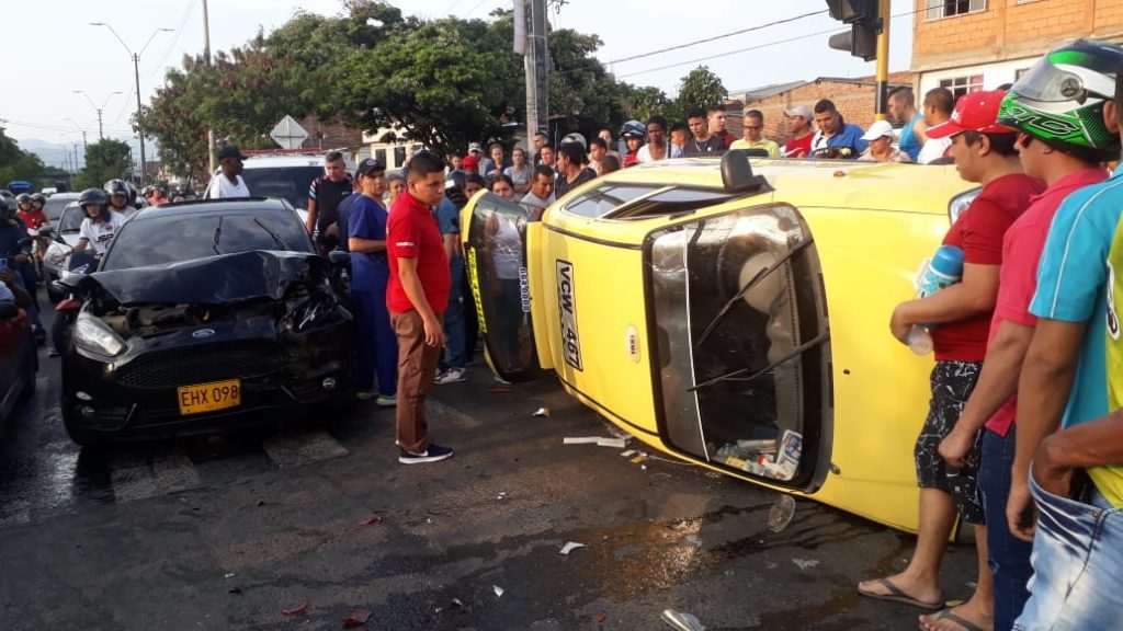 En la tarde del domingo 9 de febrero se presentó un aparatoso accidente de tránsito entre un vehículo particular y un taxi el cual sufrió volcamiento total.