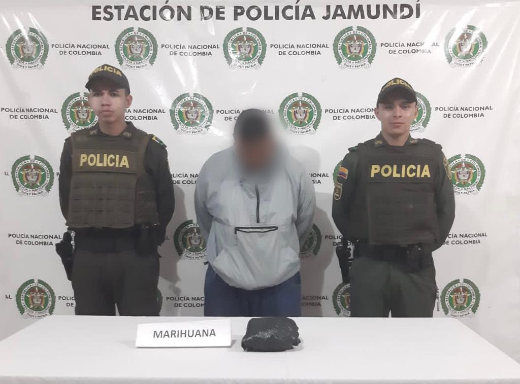 En el municipio de Jamundí con planes de registro a persona, fueron hallados 500 gramos envueltos en una bolsa plástica de color negro. "Al requerir a una persona y practicarle el registro se le encuentra en su chaqueta este paquete de esta sustancia", indica la Mecal.