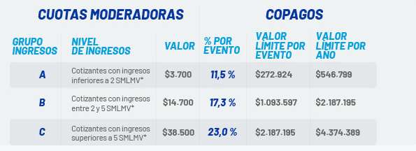 - Cotizantes con ingresos entre 2 y 5 SMLMV tendrán cuotas moderadoras con un valor de $14.700 así como un copago de valor límite por evento de $1.093.597 y un valor límite al año de $2.187.195.
