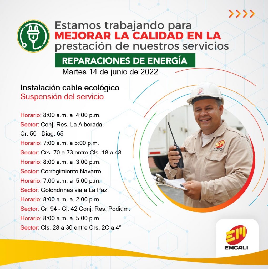 También, Emcali hará algunas reparaciones de energía en sectores como el conjunto residencial La Alborada y Golondrinas vía a La Paz, entre otros. (Ver imagen)