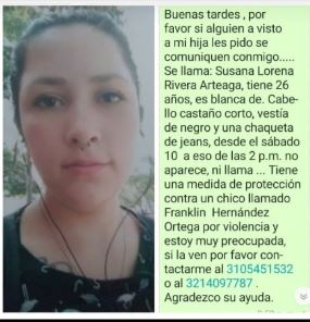 Ya son 23 días los que lleva doña Nancy Arteaga sin ver a su hija Susana Lorena Rivera Arteaga. El pasado 10 de agosto fue la última vez que la vio cuando ella salió de su casa, ubicada en el barrio El Prado al oriente de Cali, con la intención de salir a entregar unas hojas de vida. Es auxiliar de enfermería pero estaba sin trabajo.