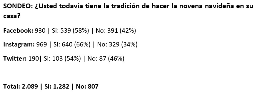 En total, en este sondeo participaron 2.089 internautas, de los cuales 1.282 respondieron que sí, que continuaban rezando la Novena de Navidad. El restante, es decir, 807 personas aseguraron que no.