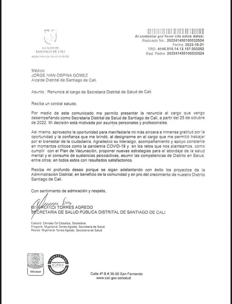Este lunes 24 de octubre se conoció la renuncia de Miyerlandi Torres como secretaria de Salud distrital de Cali. De acuerdo con la carta, Torres ya no estará en el cargo desde el 25 de octubre. Según la misiva, esta decisión se da por motivos personales y profesionales.