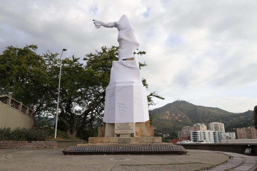 Ante el derribamiento del monumento de Sebastián de Belalcázar en Popayán, la Alcaldía de Cali cubrió con telas blancas la estatua del conquistar español que se ubica en el oeste de la ciudad.