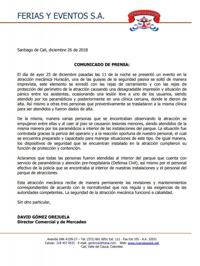 En hechos confusos se presentó la avería de uno de las atracciones mecánicas del centro recreativo River View Park, dejando varios lesionados, al parecer con traumatismos leves, al desprenderse uno de los brazos de la atracción 'el huracán'.