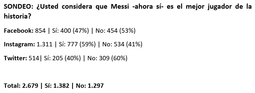 Del total de participantes en el sondeo, 1.382 personas dijeron que Messi ahora sí es el mejor jugador de la historia, en cambio, 1.297 seguidores de Q'hubo opinaron lo contrario, que todavía no le ha llegado el momento de hacer historia.