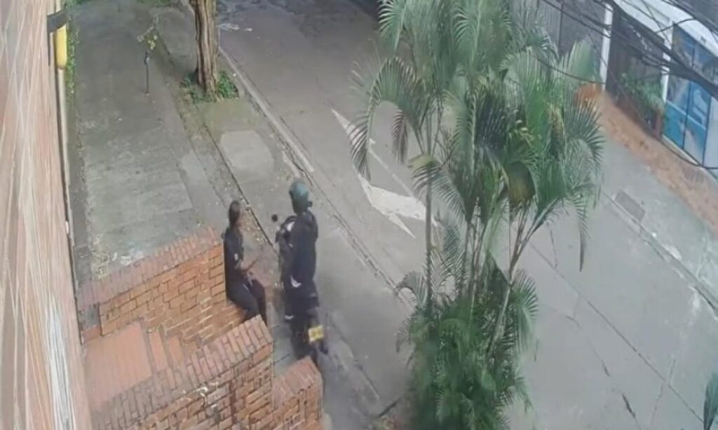 En un video quedó registrado el momento en que una mujer que estaba sentada a la entrada a un edificio; le entregó su celular a un ladrón que iba en moto y se subió al andén para abordarla.