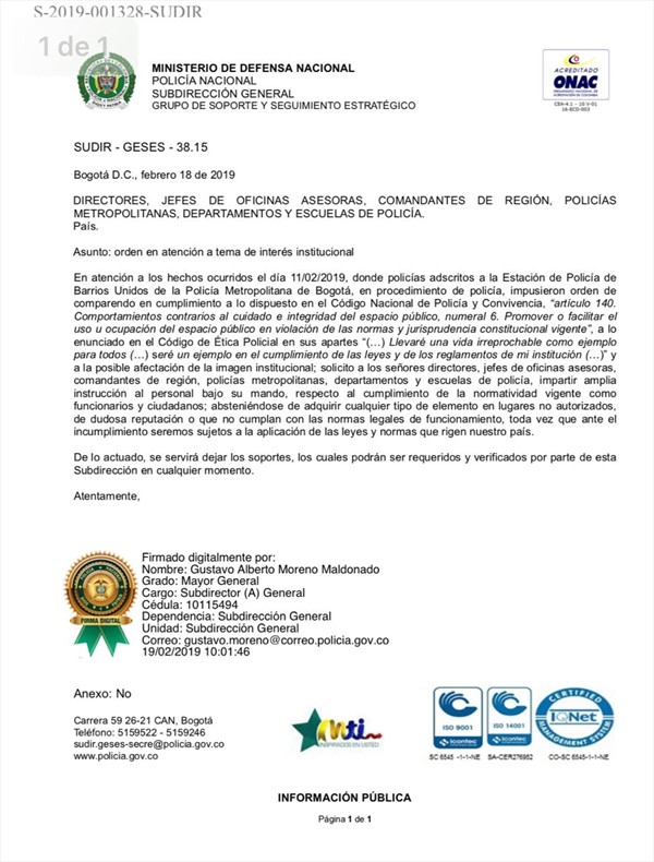 Esta orden está firmada por el subdirector de la Policía, general Gustavo Moreno Maldonado, y va dirigida a los oficiales y a su personal al mando.