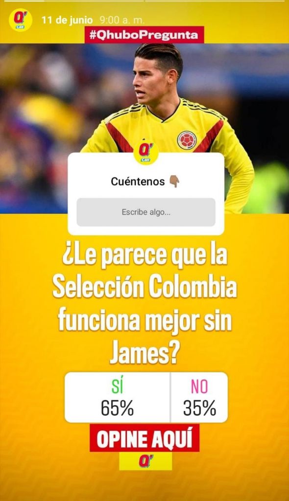 Varios usuarios de las redes sociales expresaron que creen que la Selección Colombia funciona mejor sin James. Así quedó evidenciado en un sondeo realizado por Q'hubo Cali a través de las historias de nuestra cuenta de Instagram.