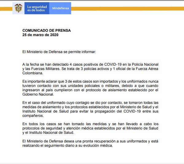 El comunicado detalló que los tres casos son importados y los uniformados nunca tuvieron contacto con sus unidades policiales o militares, debido a que cuando ingresaron al país cumplieron con el protocolo de aislamiento establecido por el Gobierno Nacional.