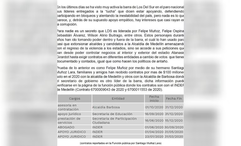 “Ser hincha de Millonarios es lo único que se necesita para poder tener trabajo en Nacional; uno de ellos, obviamente amigo de Benjamín, ahora maneja toda la producción de las Tiendas Verdes", indica Los del Sur. De acuerdo con las informaciones publicadas este lunes, varios miembros de la barra tienen contratos con la Alcaldía de Medellín. Felipe Ospina, más conocido como ‘Pipe Bandido’, uno de los líderes de la barra, tiene un total de siete contratos con la alcaldía, oscilando una suma entre un millón y diez millones de pesos.