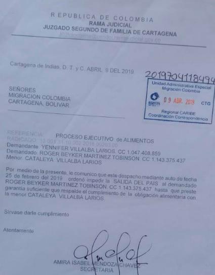 "En un documento con fecha 9 de abril de 2019 remitido a Migración Colombia, el despacho judicial ordenó impedir la salida de Martínez hasta tanto no cumpla con la obligación", detalló Caracol Radio sobre la decisión del juzgado cartagenero que se hizo pública en la mañana de este miércoles.