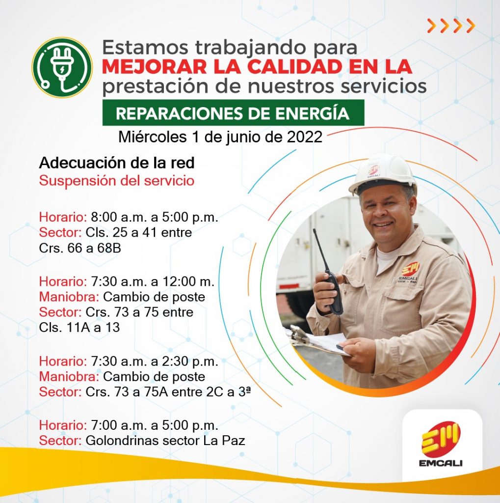 Conozca la programación de reparaciones de acueducto y energía por parte de Emcali durante este miércoles, 1 de junio.