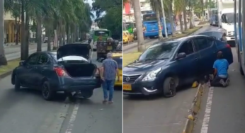 En video quedó registrado el momento en que los delincuentes le quitan los retrovisores a un carro en el trancón…