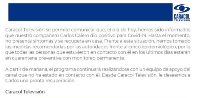 Caracol Televisión anunció este martes a través de un comunicado que Carlos Calero, presentador del programa 'Día a Día', dio positivo para Covid-19.