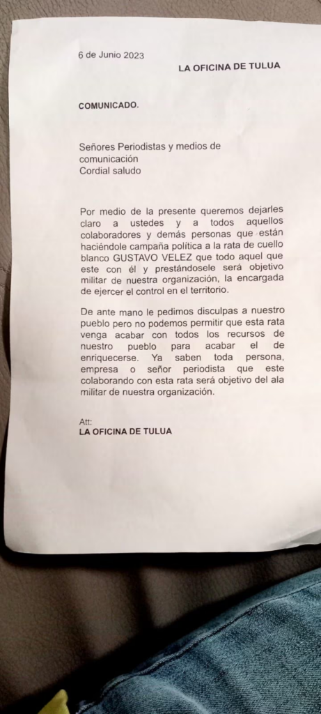 Así quedó implícito el pasado 6 de junio, cuando minutos antes de llegar a su sede para anunciar la decisión de aspirar de nuevo al cargo, un vehículo blanco se atraviesa en la vía y dos hombres descienden y descargan ráfagas de fusil contra la instalación. Acto seguido, ponen a circular un ‘comunicado’ en el que declaran objetivo militar a cualquier periodista que emita alguna información que haga referencia a la precandidatura o la campaña de Gustavo Vélez.