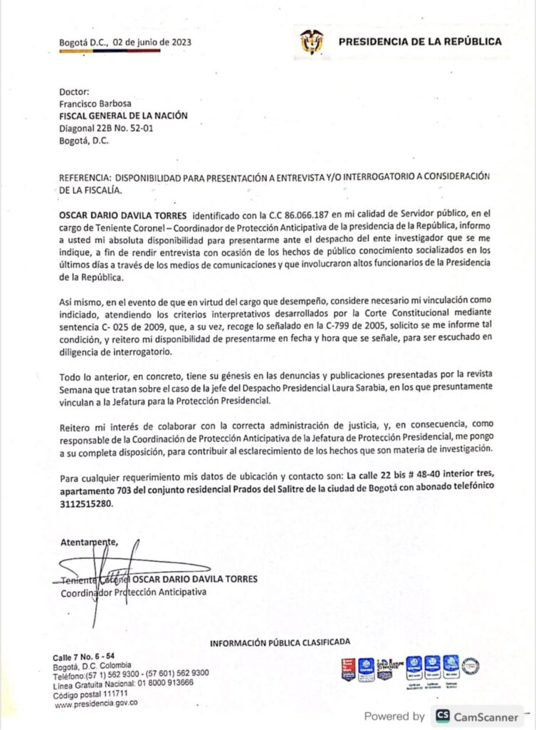 En la noche del viernes 9 de junio, las autoridades confirmaron el trágico desenlace de Óscar Dávila, quien tenía a su cargo la protección y seguridad de la residencia presidencial. Su salida del cargo se produjo en medio de un escándalo por interceptaciones ilegales que involucraban a Marelbys Meza, exniñera del hijo de Laura Sarabia.