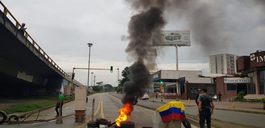 La primera entrada a Cali en amanecer taponada fue la de Sameco. Desde muy temprana el sector amaneció bloqueado y a esta hora los manifestantes queman llantas y retrasan el servicio del MIO.