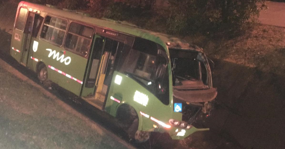 La madrugada de este jueves 17 de enero se presentó un accidente de tránsito en la Calle 5 con 80, en el barrio Capri. Un bus alimentador del MIO perdió el control y se fue directo a un caño del sector.