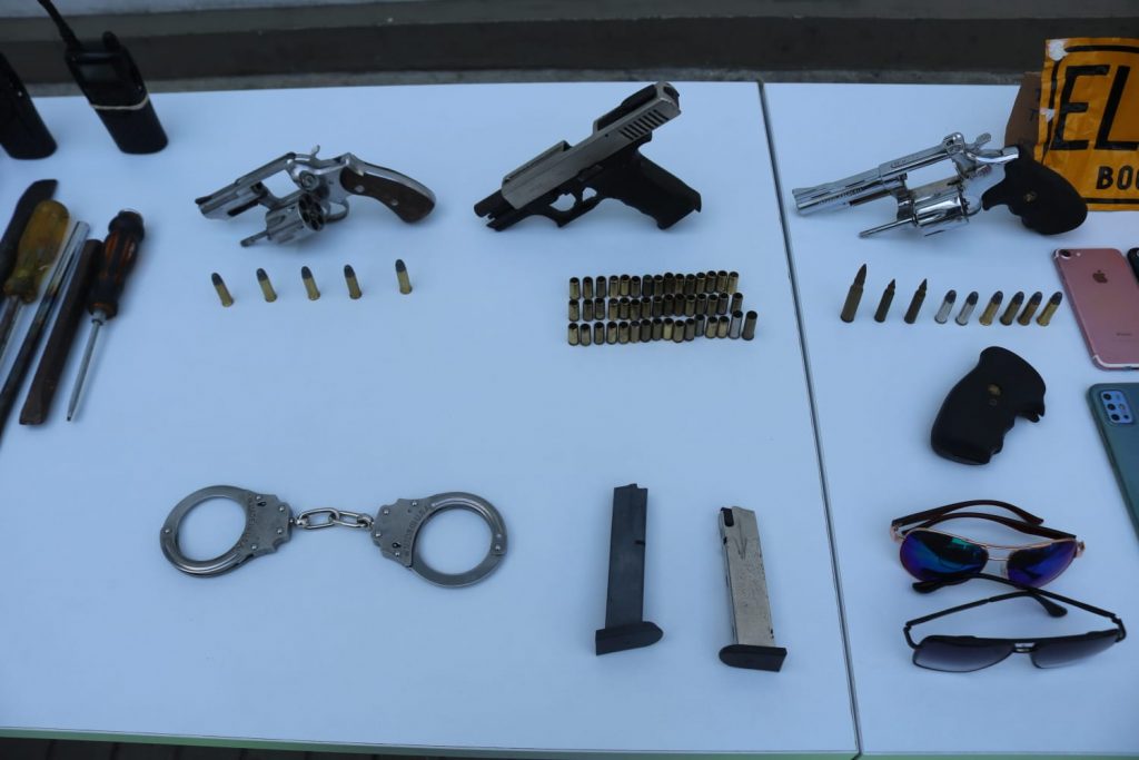 A los indiciados se les incautó tres vehículos, tres motocicletas, dos armas de fuego, dos armas traumáticas, un cilindro de acetileno y herramientas para abrir puertas.