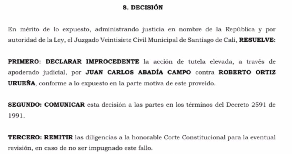 Asimismo, en la grabación Ortiz expuso un fragmento de la respuesta del juzgado en donde se expresa: "Declarar improcedente la acción de tutela elevada, a través de apoderado judicial, por Juan Carlos Abadía Campo contra Roberto Ortiz Ureña".