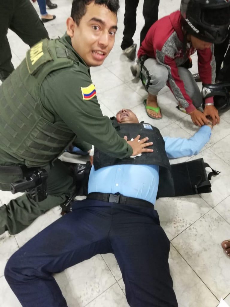 En redes sociales se hizo viral ayer la fotografía de un policía en la que aparece auxiliando a un vigilante herido a bala. Al fondo se ve a una persona tratando de quitarle el reloj, y muchos dijeron que el joven lo estaba robando.