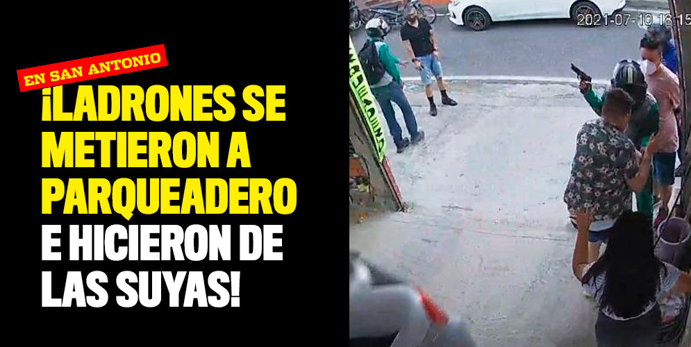 En el costado contrario al parqueadero, llegan dos motociclistas uniformados de verde, quienes se bajan con armas para hurtar a los del parqueadero que allí se encontraban. Luego, el motociclista que antes había pasado vestido de azul, también resulta siendo un ladrón, ingresa y con arma en mano amedrenta a las personas del lugar.