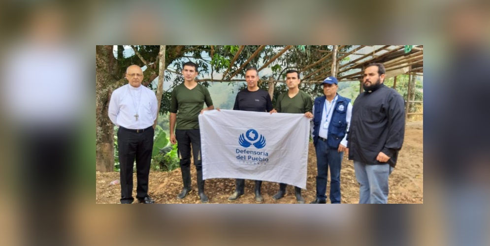 En la imagen aparecen los tripulantes de la aeronave con una bandera de la Defensoría del Pueblo y acompañados por un sacerdote y los miembros de la entidad que conformaban la comisión humanitaria.