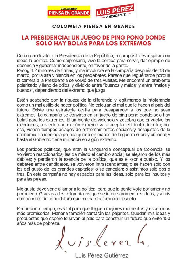 Por medio de un comunicado, el aspirante a la Casa de Nariño del Movimiento Ciudadano Colombia Piensa en Grande, Luis Pérez Gutiérrez, renunció a su aspiración por la Presidencia.