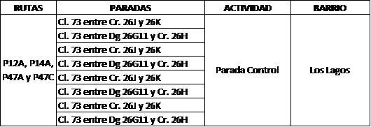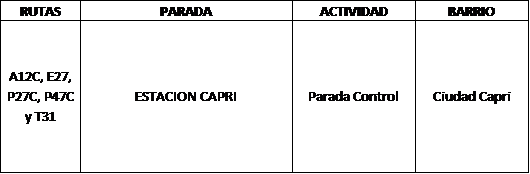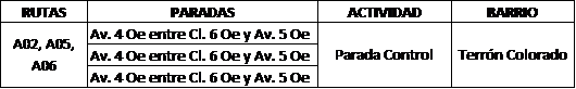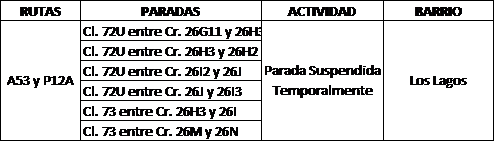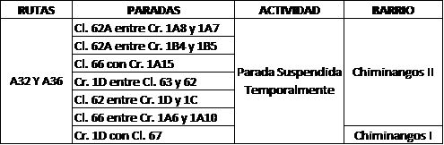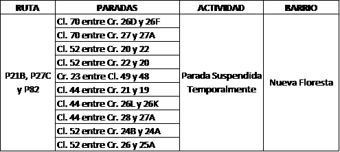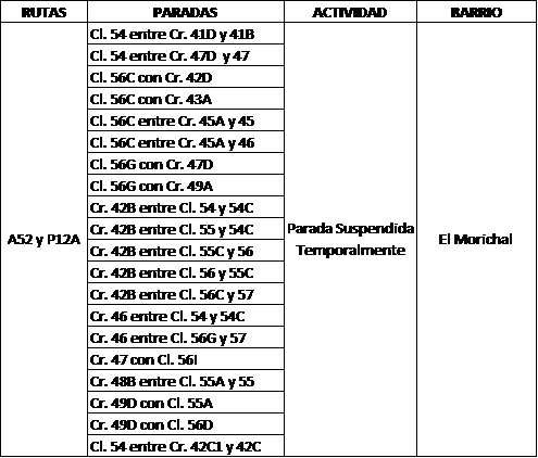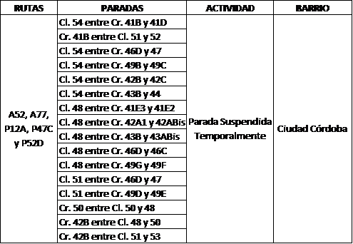 A continuación, se relacionan las rutas, los barrios y las paradas que serán suspendidas temporalmente: