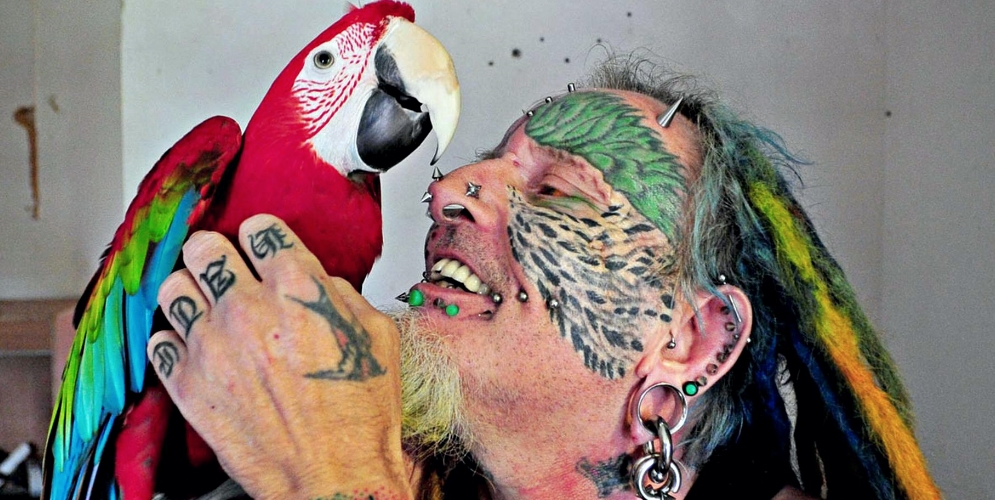 Este hombre es también un enamorado a morir de los loros y las guacamayas, y un día cualquiera decidió que quería parecerse a dichas aves, y para ello comenzó a tatuarse la frente y el rostro con plumas coloridas.