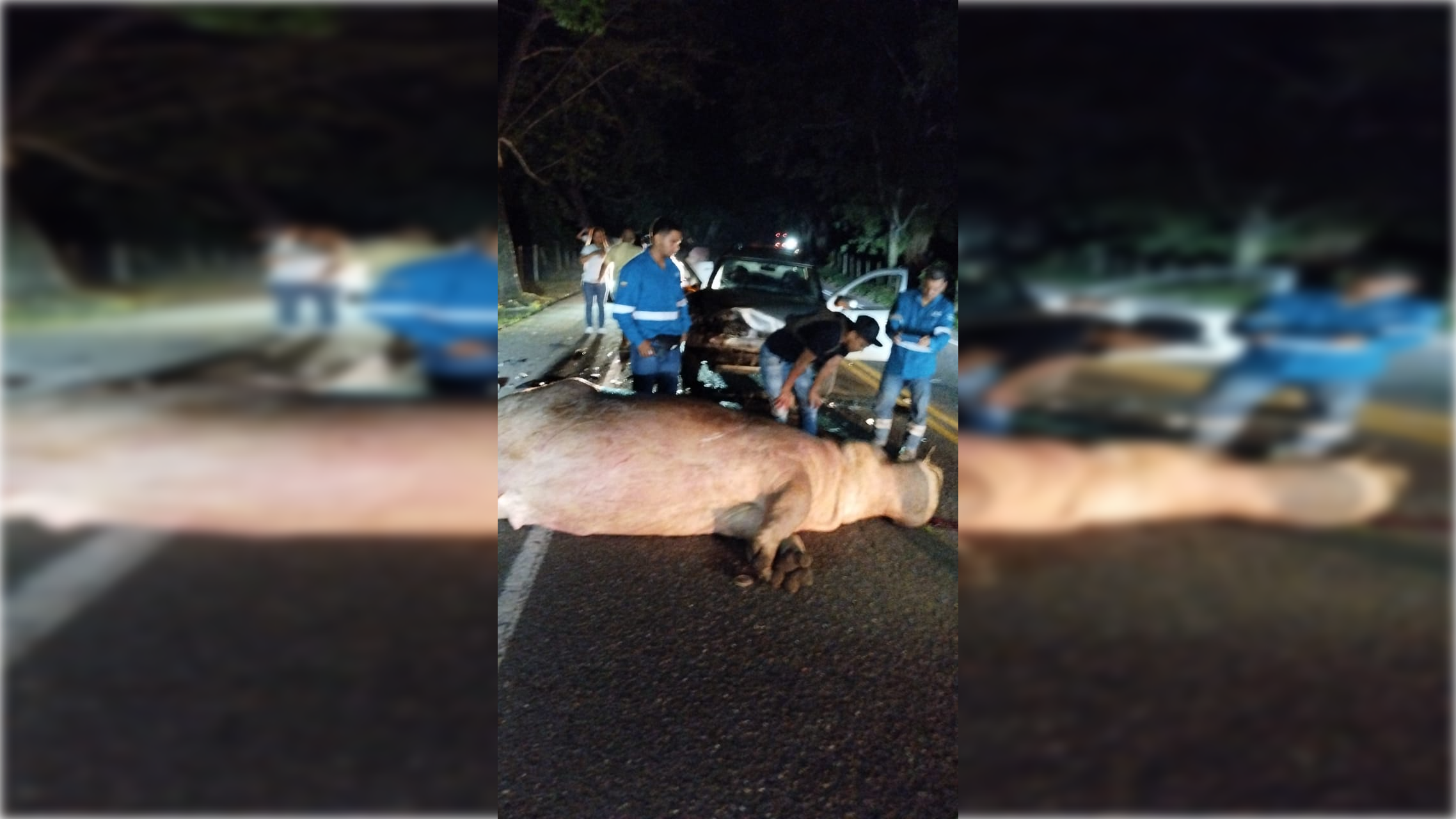 Según se conoció, debido al fuerte choque, el animal murió en el lugar donde ocurrió el accidente, mientras que los ocupantes del vehículo resultaron heridos. El conductor, al parecer, tenía poca visibilidad en la vía y no pudo evitar al hipopótamo.