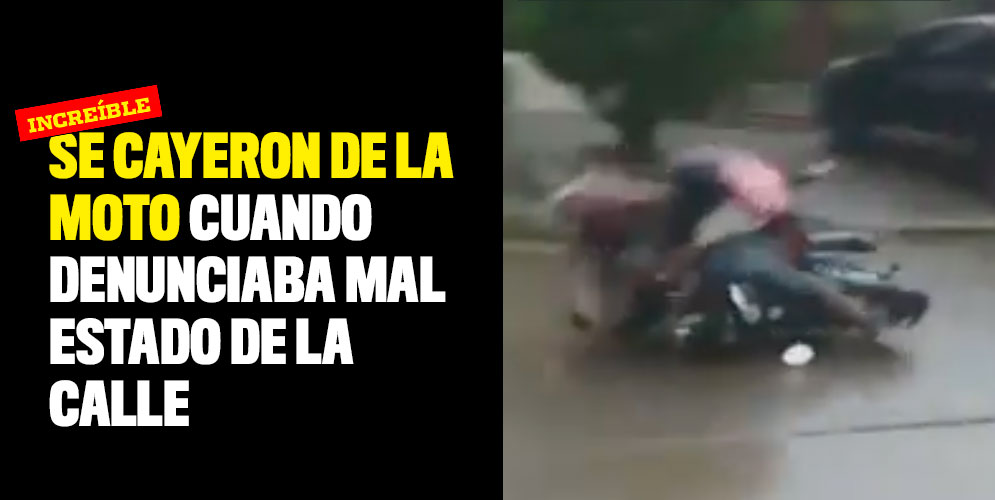 El hombre, en medio de su denuncia por el mal estado de la vía, quedó sorprendido al ver como una moto se va de lado y cae.