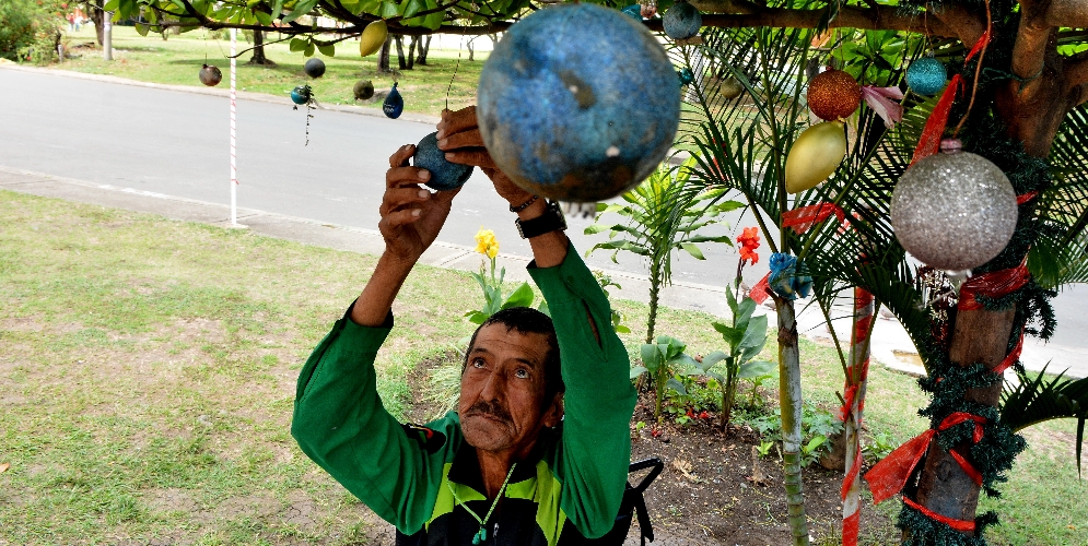 “Desde que llegue acá el árbol ha estado decorado todo el año, aunque se le caen los adornos por la lluvia y el sol, siempre 'Mangas' y yo estamos pendientes para ponerle nuevos adornos que lo hagan ver bien bonito”.