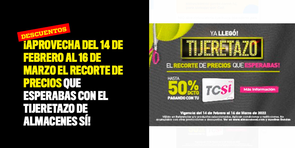 Almacenes Sí vuelve con el Tijeretazo, el recorte de precios que esperabas del 14 de febrero al 16 de marzo del 2022. Obtén la mejor oferta de productos a precios que no te puedes perder: telas de moda, vestuario, ropa interior, uniformes, productos para el hogar y telas para cortineria y tapicería. Encuéntralos en Unicentro, Cosmocentro, Norte, Calima, Centro y Palmira; a través de su tienda virtual en www.almacenessi.com o en su línea de Whatsapp al 318 674 5874.