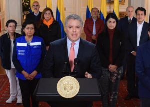 "Por esto, en desarrollo del estado de Emergencia, aplicaremos un aislamiento preventivo obligatorio para todos los colombianos, desde el próximo martes 24 de marzo a las 23 y 59 horas, hasta el lunes 13 de abril a las 00:00 horas. Esta decisión no suspende ni de ninguna manera altera los simulacros de aislamiento preventivo que se encuentran en curso", anunció el jefe de Estado.
