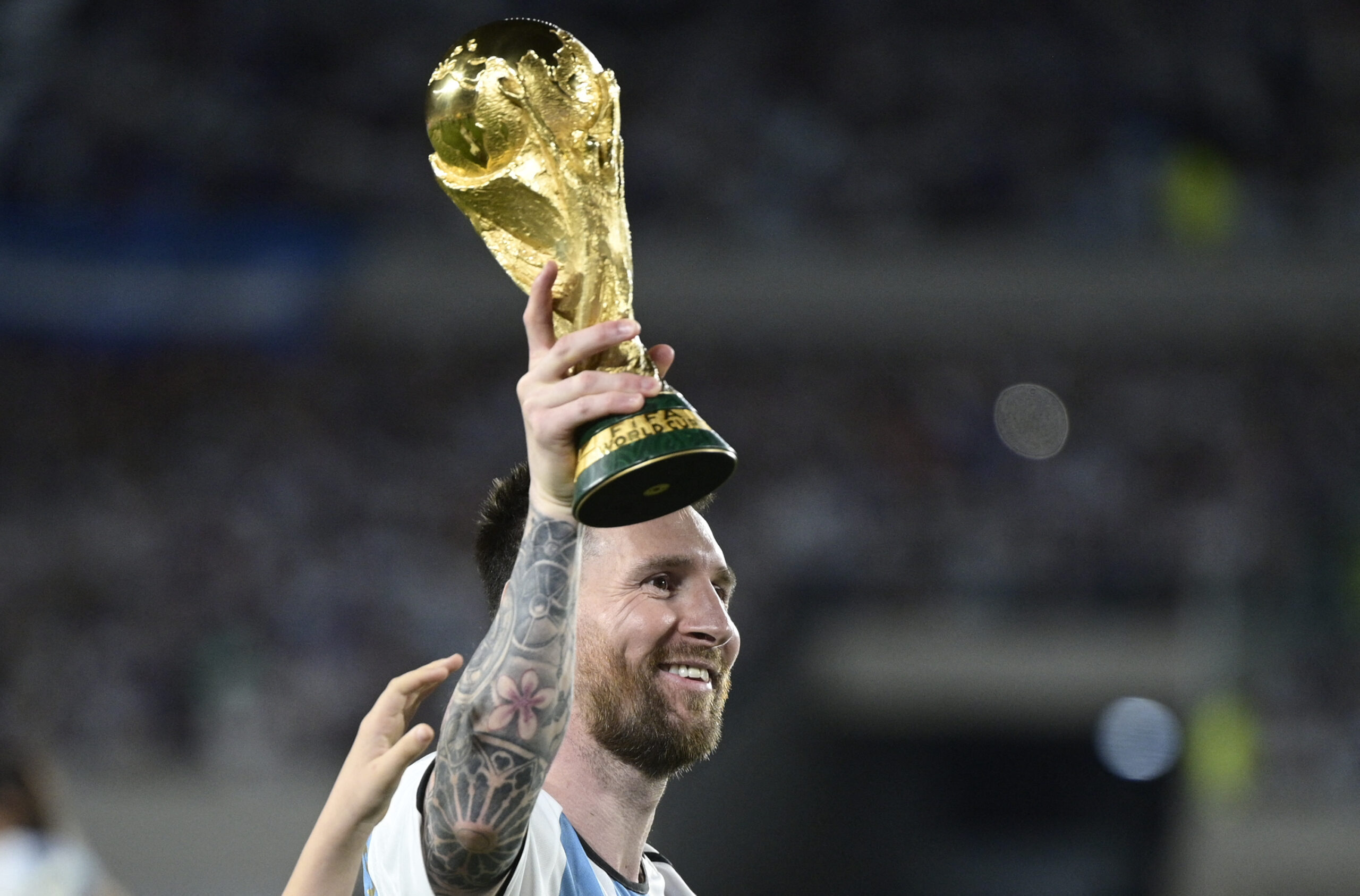 Argentina's forward Lionel Messi raises a replica of the World Cup trophy during a recognition ceremony for the World Cup winning players, following the friendly football match between Argentina and Panama at the Monumental stadium in Buenos Aires on March 23, 2023. - Lionel Messi capped a night of unbridled joy with the 800th goal of his career as world champions Argentina celebrated their homecoming with a 2-0 friendly victory over stubborn Panama in Buenos Aires on Thursday. (Photo by JUAN MABROMATA / AFP)