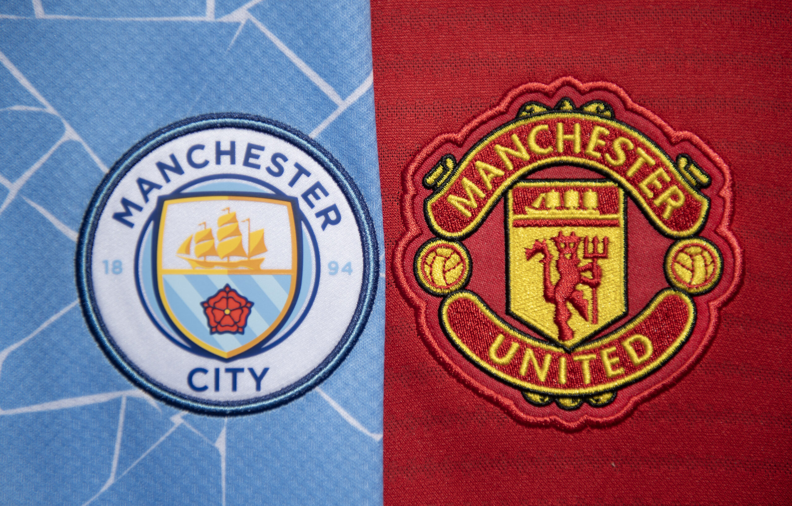 MANCHESTER, ENGLAND - MAY 24: The club badges of Manchester City and Manchester United ahead of the 2023 FA Cup Final on May 24, 2023 in Manchester, United Kingdom. (Photo by Visionhaus/Getty Images)