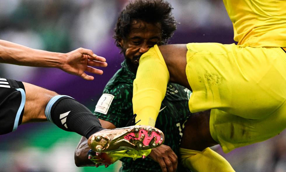 Pues en los últimos instantes del partido y por querer asegurar la victoria, los jugadores de Arabia Saudita estaban dejando todo en la cancha. En medio de una jugada de tiro libre a favor de Argentina, el arquero del conjunto árabe estrelló su rodilla en la cara de Al Shahrani.