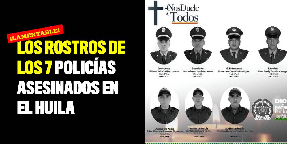 Estos uniformados fueron identificados como los intendentes Luis Alberto Sabi Gutiérrez y Wilson Jair Cuéllar Losada; los patrulleros Jhon Fredy Bautista Vargas y Duverney Carreño Rodríguez; y los auxiliares Arles Mauricio Pascuas Figueroa, Santiago Gómez Endes y Cristian Ricardo Cubillos Borbón.