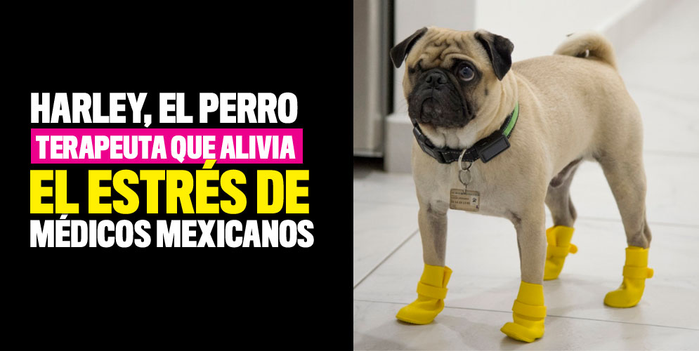 Harley 'el Tuerto' es un perro pug entrenado como terapeuta, que ahora tiene la misión de aliviar el estrés del personal médico que lucha contra el coronavirus en un hospital de Ciudad de México, hasta donde llega y se queda juegueteando por dos horas con médicos y enfermeras, a quienes les arrebata sonrisas en medio de su extenuante jornada.