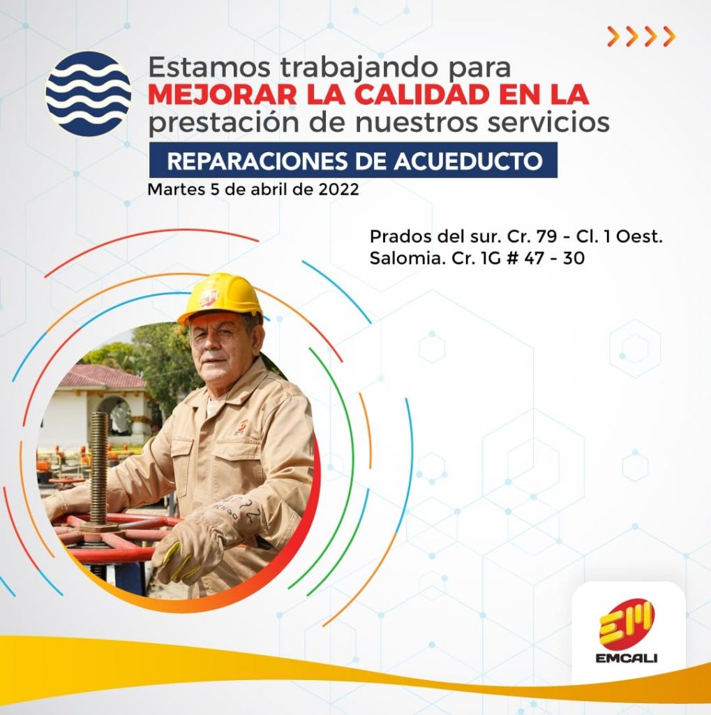 Empresas Municipales de Cali, Emcali anunció las reparaciones de daños de acueducto programadas para este martes, 5 de abril de 2022, en la ciudad de Cali.