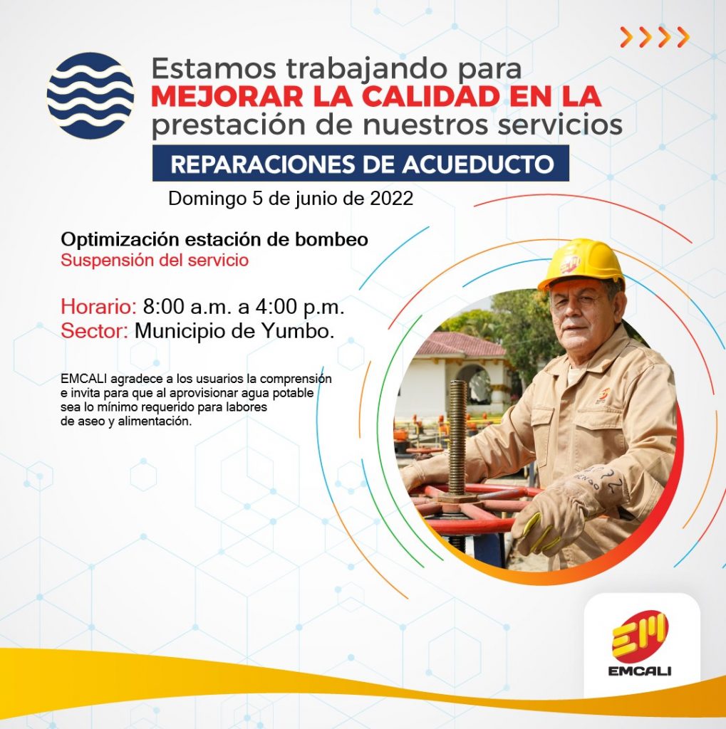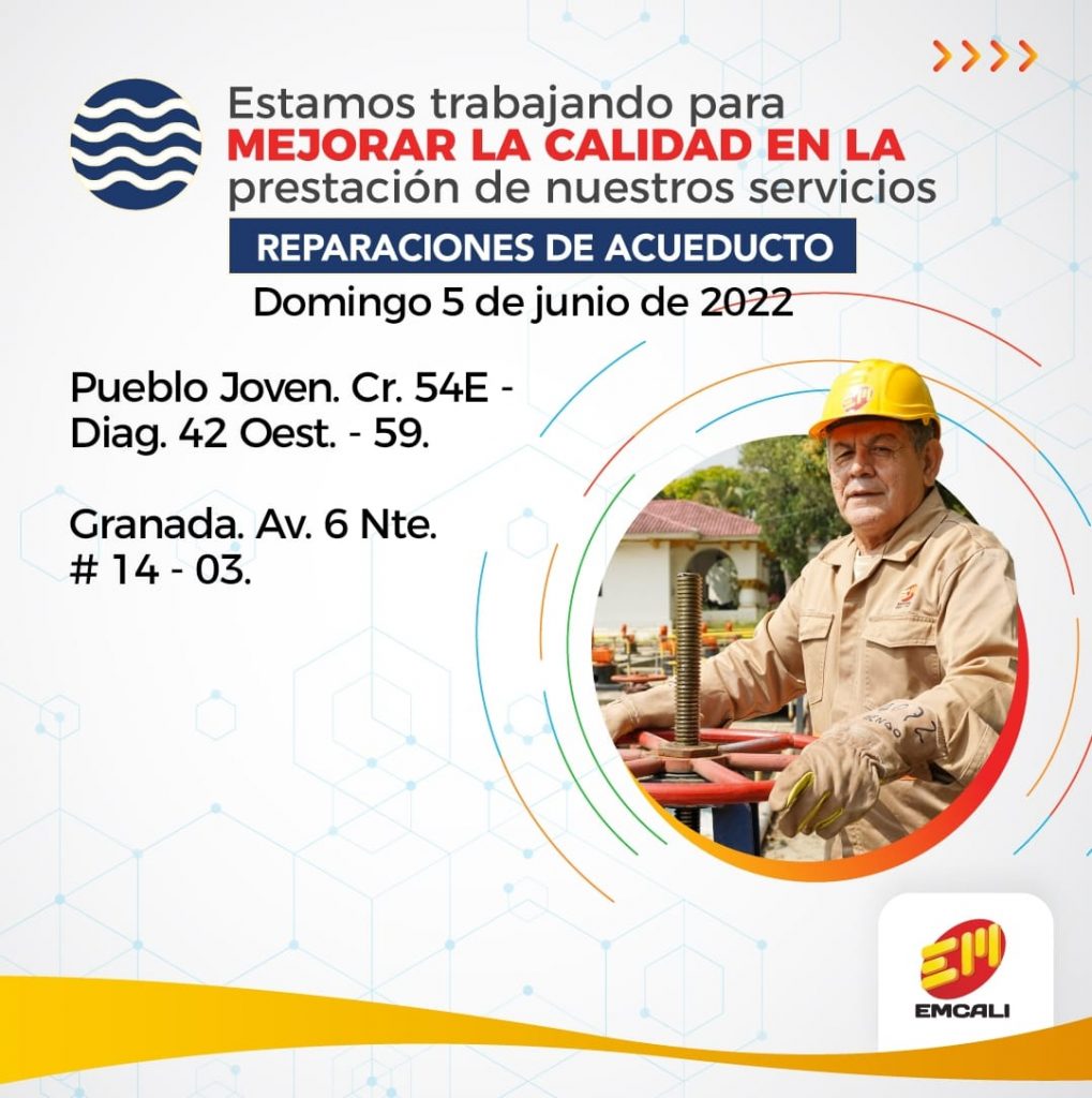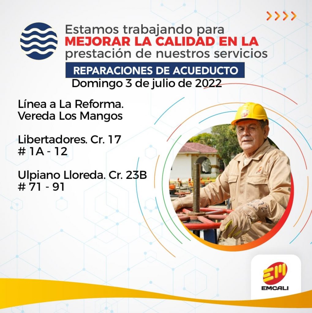 Empresas Municipales de Cali, Emcali anunció las reparaciones de daños de acueducto programadas para este domingo 3 de julio de 2022, en la ciudad de Cali.