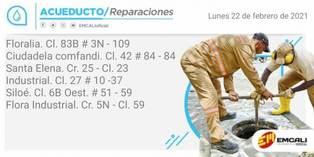 Hoy lunes, 22 de febrero, Emcali intervendrá la red acueducto por lo que se suspenderá de manera temporal el servicio de agua potable en varios sectores de Cali.
