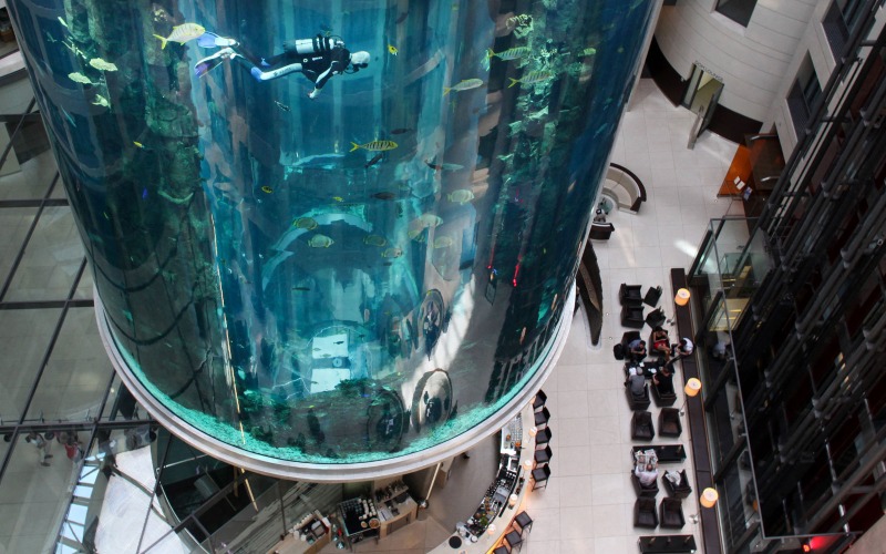 El AquaDom, una estructura de unos catorce metros de altura, se presenta en su página web como "el acuario cilíndrico más grande del mundo".