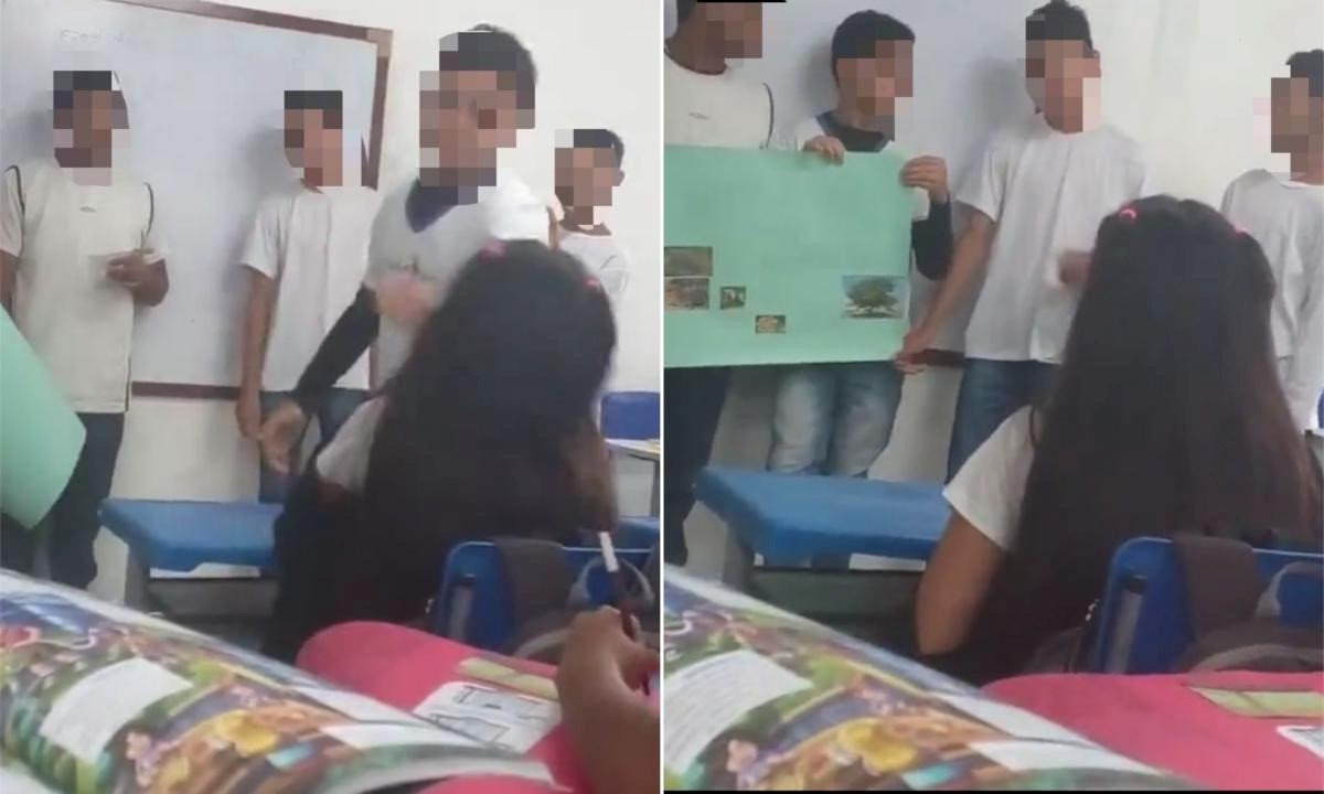 Aunque en la grabación no se escucha que la menor se haya reído o haya hecho gestos burlones, en un momento dado y menos esperado, el niño cambió su rostro drásticamente, soltó la cartelera y golpeó a su compañera en el rostro, provocando su caída al suelo.